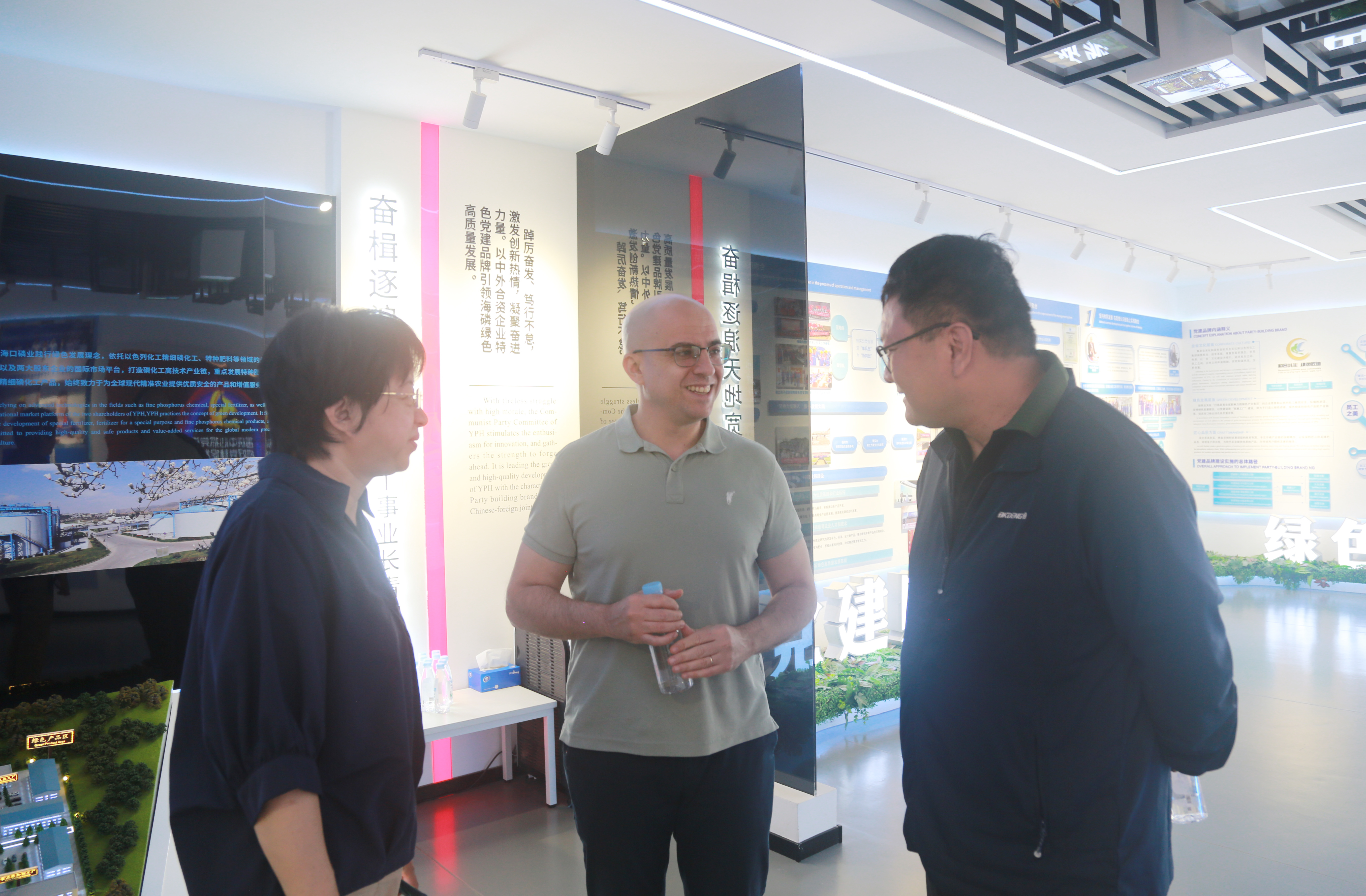 在“合文化”展廳,蔡彬亭詳細介紹公司“和合共生 綠色匠造”的中外合資黨建品牌建設成果,結合圖文展板、視頻和產品實物生動講解和展示了公司以黨建為引領,推動中外文化融合發(fā)展的創(chuàng)新實踐。強調公司在省市各級政府的關心支持下,通過改革謀發(fā)展、創(chuàng)新求突破,大力推進產業(yè)結構優(yōu)化和產品轉型升級等舉措。